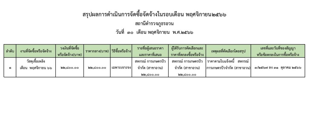 สรุปผลการดำเนินการจัดซื้อจัดจ้างในรอบเดือน พ.ย.66 ปีงบประมาณ พ.ศ. 2567