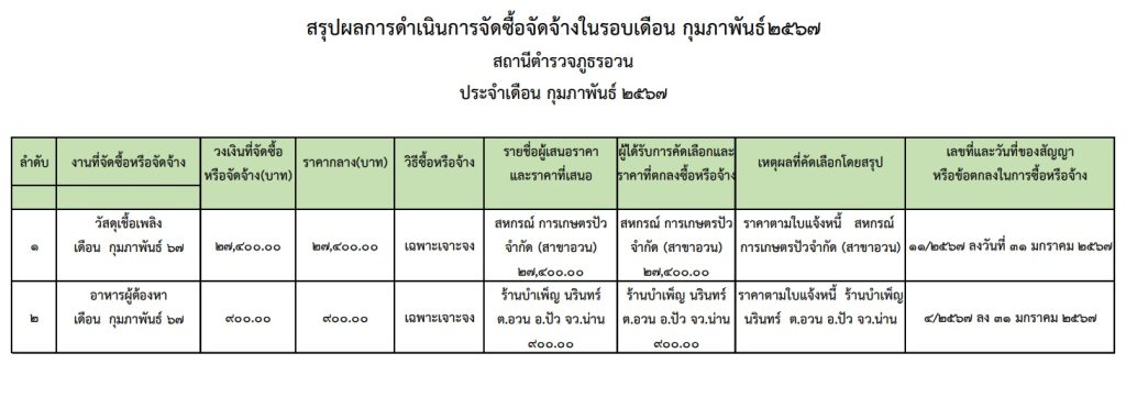 สรุปผลการดำเนินการจัดซื้อจัดจ้างในรอบเดือน ก.พ.67 ปีงบประมาณ พ.ศ. 2567