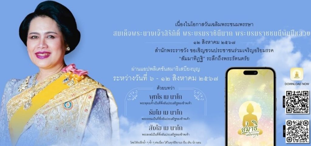 สำนักพระราชวัง ขอเชิญชวนประชาชนร่วมเจริญอริยมรรค “สัมมาทิฏฐิ” ระลึกถึงพระรัตนตรัย ด้วยบทว่า พุทโธ เม นาโถ (พระพุทธเจ้าเป็นที่พึ่งอันประเสริฐของข้าพเจ้า) ธัมโม เม นาโถ (พระธรรมเป็นที่พึ่งอันประเสริฐของข้าพเจ้า) สังโฆ เม นาโถ (พระสงฆ์เป็นที่พึ่งอันประเสริฐของข้าพเจ้า) (โดยให้ระลึกย้ำ ๆ ซ้ำ ๆ ต่อเนื่องได้ในทุกอิริยาบถ ยืน เดิน นั่ง นอน) ถวายเป็นพระราชกุศล แด่สมเด็จพระนางเจ้าสิริกิติ์ พระบรมราชินีนาถ พระบรมราชชนนีพันปีหลวง เนื่องในโอกาสวันเฉลิมพระชนมพรรษา ๑๒ สิงหาคม ๒๕๖๗ ระหว่างวันที่ ๖ สิงหาคม ๒๕๖๗ เวลา ๐๘.๐๐ น. ถึง วันที่ ๑๒ สิงหาคม ๒๕๖๗ เวลา ๐๘.๐๐ น. ทั้งนี้ สามารถดาวน์โหลดแอปพลิเคชันได้ทั้ง PLAY STORE และ APP STORE
