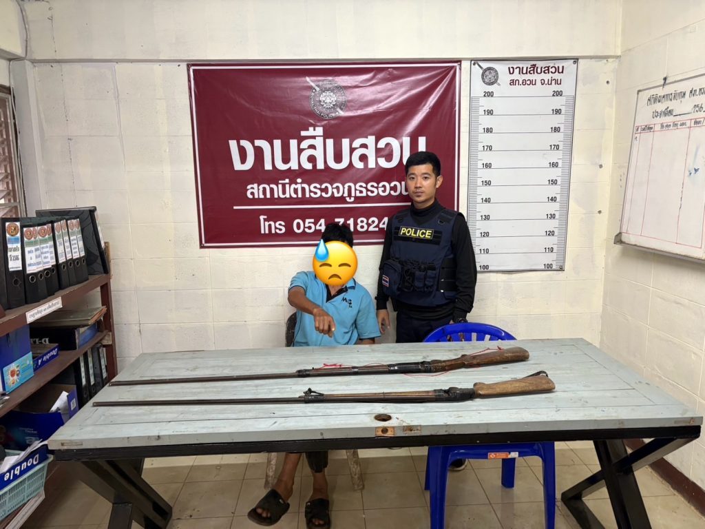 อ้างถึงหนังสือ ภ.จว.น่าน ด่วนที่สุด ที่ 0020.(นน)/164 ลงวันที่ 20 มี.ค. 68 ให้ทุกหน่วย ในสังกัด ภ.จว.น่านระดมกวาดล้างอาชญากรรมทุกประเภทในพื้นที่รับผิดชอบประจำเดือน มี.ค.68 ระหว่างวันที่ 21-27 มี.ค.2568 และก่อนเกิดเหตุ เมื่อวันที่ 21 มี.ค.2568 เวลาประมาณ 06.00น.เจ้าหน้าที่ตำรวจ สภ.อวน ได้สนธิกำลังนำหมายค้นของศาลจังหวัดน่าน (สาขาปัว)ที่ ค25/2568 ลง 20 มี.ค.2568 เมื่อไปถึงพบผู้ต้องหา แสดงตัวเป็นเจ้าบ้าน บ้านเลขที่ 7 ม.4 ต.อวน อ.ปัว จ.น่าน จึงได้แสดงตัวเป็นเจ้าหน้าที่ตำรวจและแสดงหมายค้นของศาลจังหวัดน่าน (สาขาปัว)ที่ ค25/2568 ลง 20 มี.ค.2568 ให้ผู้ต้องหา อ่านและดูเป็นที่พอใจแล้ว และผู้ต้องหาสมัครใจและยินยอมให้การตรวจค้น ก่อนทำการตรวจค้นเจ้าหน้าที่ตำรวจได้แสดงความบริสุทธิ์เป็นที่พอใจแล้ว โดยผู้ต้องหาเป็นผู้นำในการตรวจค้น ขณะทำการตรวจค้นพบอาวุธปืนยาวไทยประดิษฐ์ จำนวน 2 กระบอก ลำดับที่1. กระบอกที่หนึ่ง อาวุธปืนยาวไทยประดิษฐ์ (ปืนแก๊ป) ไม่มีเลขประจำปืนและเครื่องหมายทะเบียน วางอยู่บนกองไม้ในโรงจอดรถ ลำดับที่2. กระบอกที่สอง อาวุธปืนยาวไทยประดิษฐ์ (ปืนแก๊ป) ไม่มีเลขประจำปืนและเครื่องหมายทะเบียน วางอยู่บนที่นอนในห้องนอนชั้นที่สองของบ้าน จากนั้นได้ขอตรวจปัสสาวะหาสารเสพติดในเบื้องต้นโดยความยินยอมของผู้ต้องหาผลการตรวจเบื้องต้นโดยชุดตรวจสอบแบบตลับพบผลเป็นลบ ผู้ต้องหา รับว่าอาวุธปืนดังกล่าวเป็นของตนจริง เจ้าหน้าที่ตำรวจจึงได้แจ้งข้อกล่าวหา “ มีอาวุธปืนไว้ในครอบครองโดยไม่ได้รับอนุญาต” จึงได้ควบคุมตัวผู้ต้องหาและของกลางส่งพนักงานสอบสวนสถานีตำรวจภูธรอวน เพื่อดำเนินคดีตามกฎหมายต่อไป