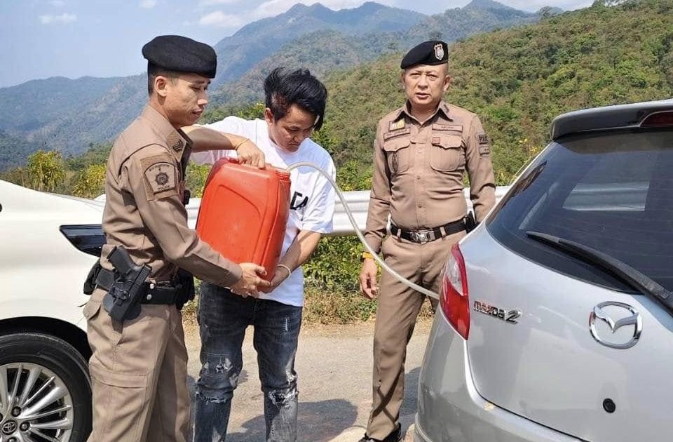 เจ้าหน้าที่ตำรวจสภ.อวนช่วยเหลือเต็มน้ำมันให้แก่นักท่องเที่ยว