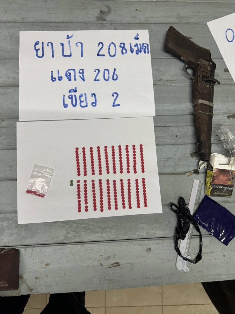 ยาบ้าของกลาง 208 เม็ด และอาวุธปืนนำส่งพนักงานสอบสวนเพื่อดำเนินคดีตามกฎหมายต่อไป