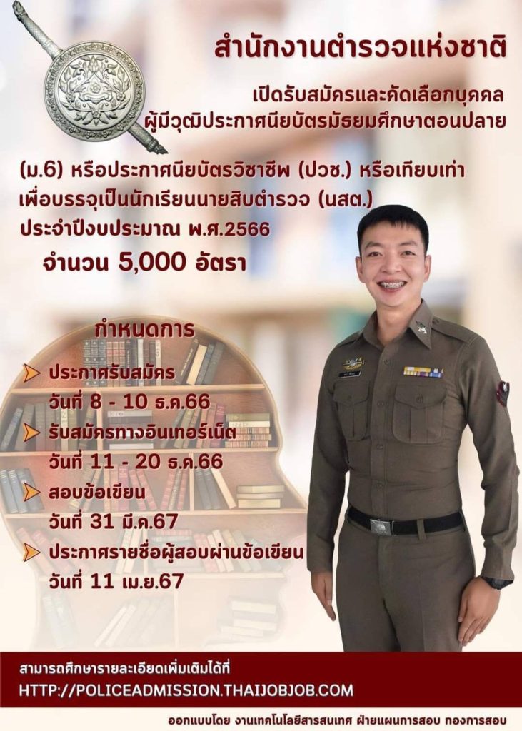 เปิดรับสมัครนักเรียนนายสิบตำรวจ 29 พฤศจิกายน 2566 โดย admin / ข่าวประชาสัมพันธ์,ข่าวฝากประชาสัมพันธ์,ไม่มีหมวดหมู่ เปิดรับสมัครและคัดเลือกบุคคลผู้มีวุฒิประกาศนียบัตรมัธยมศึกษาตอนปลาย (ม.6) หรือประกาศนียบัตรวิชาชีพ (ปวช.) หรือเทียบเท่าเพื่อบรรจุเป็นนักเรียนนายสิบตำรวจ (นสต.)ประจำปีงบประมาณ พ.ศ.2566 จำนวน 5000 อัตรา กำหนดการ ประกาศรับสมัคร– วันที่ 8 – 10 ธ.ค.66รับสมัครทางอินเทอร์เน็ต– วันที่ 11 – 20 ธ.ค.66สอบข้อเขียน– วันที่ 31 มี.ค.67ประกาศรายชื่อผู้สอบผ่านข้อเขียน– วันที่ 11 เม.ย.67 ศึกษารายละเอียดเพิ่มเติมได้ที่ http://policeadmission.thaijobjob.com FacebookFacebookLINELine