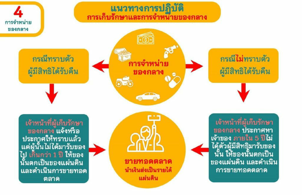 การตรวจสอบเเละจัดเก็บรถของกลาง สถานที่จัดเก็บของกลาง เป็นสัดส่วนมีมาตรการตามระเบียบตามแนวทางของ ตร.กำหนด