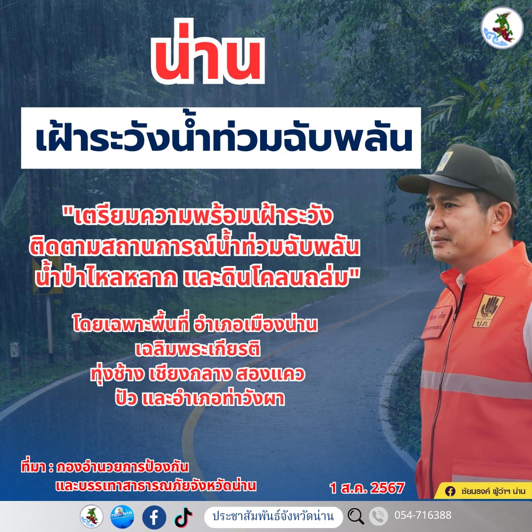 น่าน เฝ้าระวังน้ำท่วมฉับพลัน น้ำป่าไหลหลาก และดินโคลนถล่ม